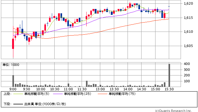 前日終値 1609.5円 → 本日終値 1619円 -8343円