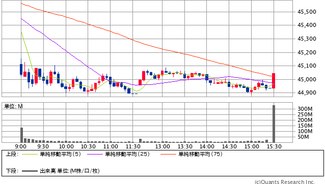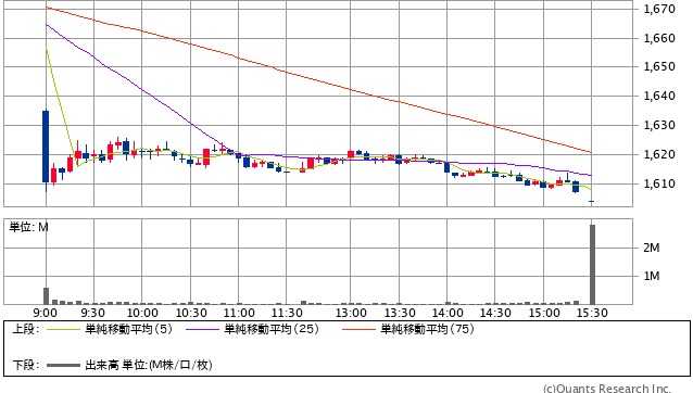 前日終値 1665.5円 → 本日終値 1604円 +7526円