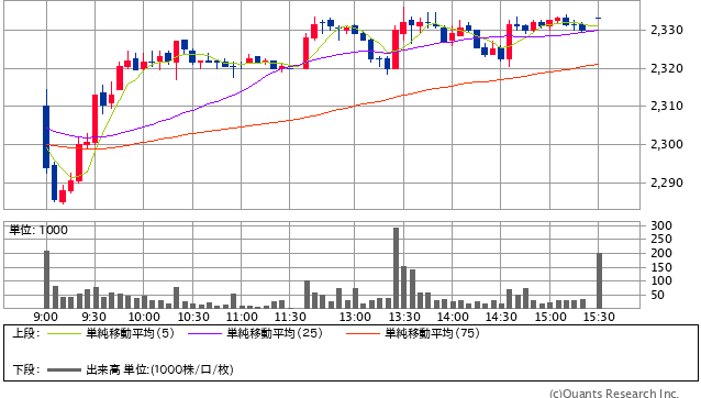 前日終値 2299円 → 本日終値 2333円 -6236円