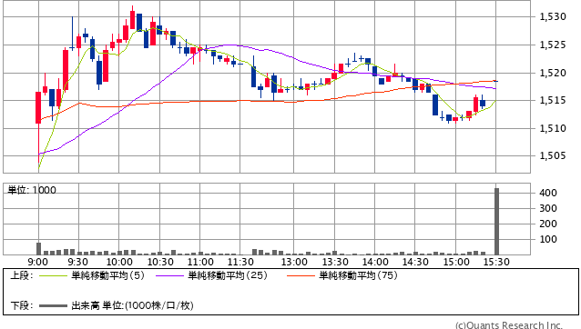 前日終値 1499.5円 → 本日終値 1518.5円 -3757円