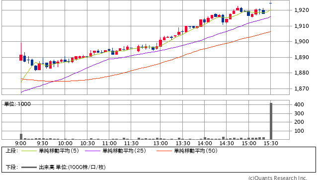 前日終値 1870円 → 本日終値 1924.5円 -4183円