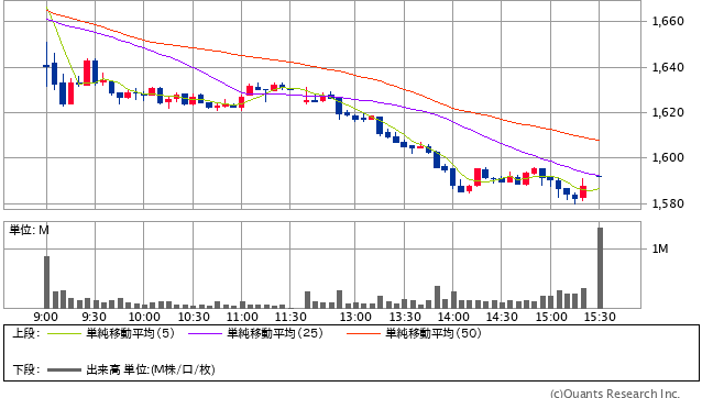 前日終値 1672.5円 → 本日終値 1592円 -13076円