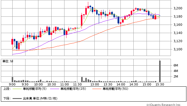 前日終値 3105円 → 本日終値 3182円 +6578円