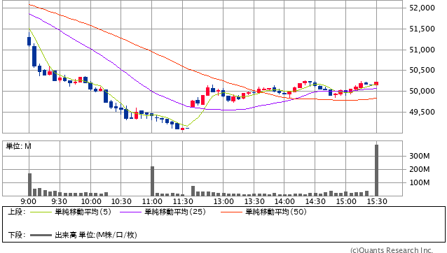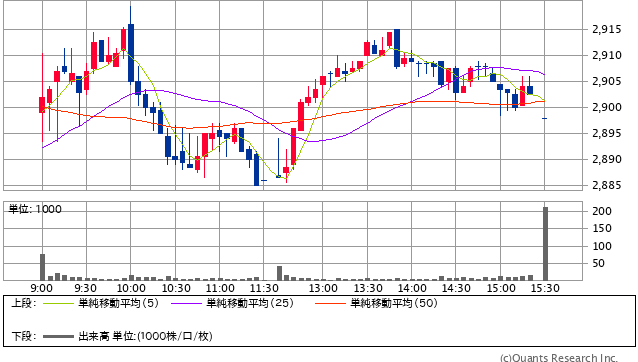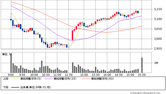 前日終値 3147円 → 本日終値 3150円 +3262円