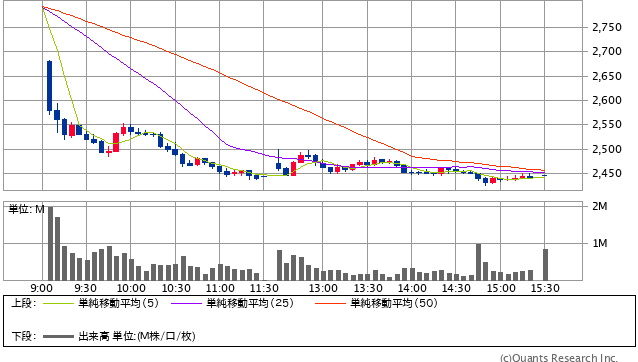 前日終値 2791円 → 本日終値 2444.5円 -34657円