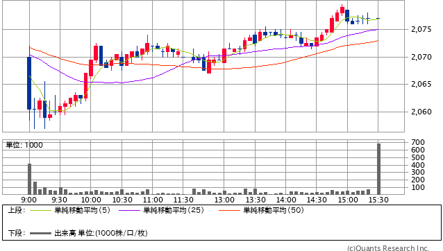 前日終値 2067円 → 本日終値 2074円 -14993円