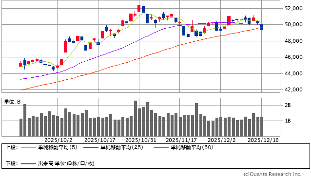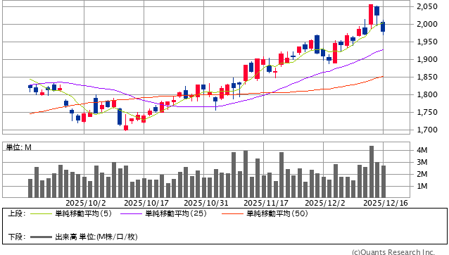 前日終値 1990.5円 → 本日終値 1977円 -745円