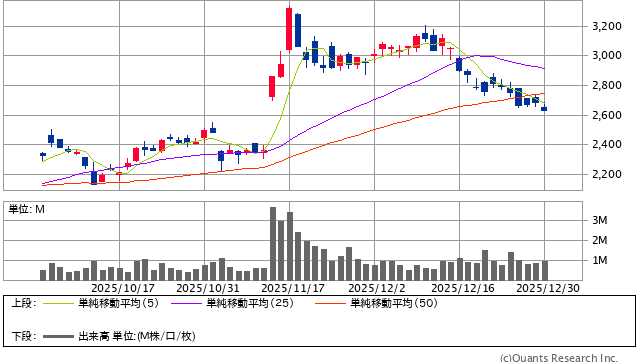 前日終値 2685.5円 → 本日終値 2642.4円 +993円