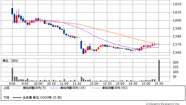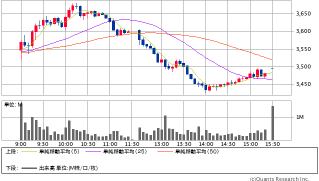 前日終値 3551.7円 → 本日終値 3569円 +1676円
