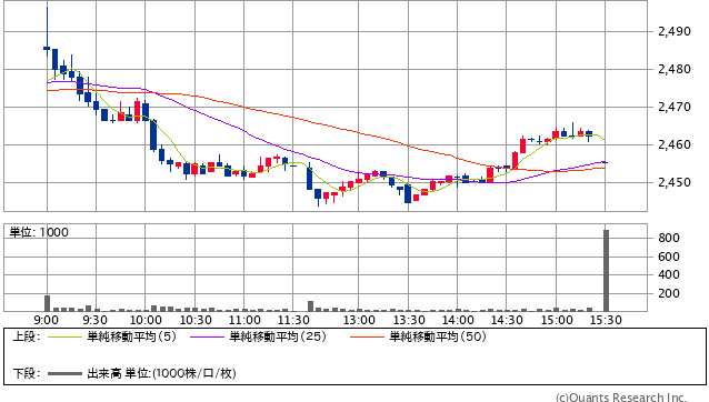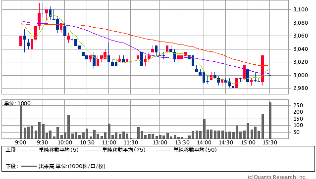 今日の感じだと、ここは大丈夫だろうと思った2980円に損切りポイントを設定していたが、今回もぎりぎりそこに触れてそこから上昇。