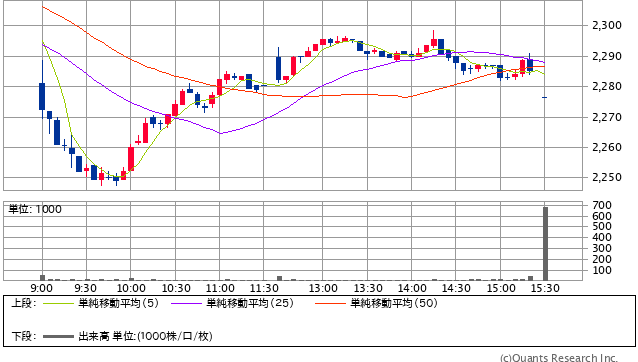 迷ったが、地盤も上へ急激に向かい始めていたので、2263円で順張りで買い増し。