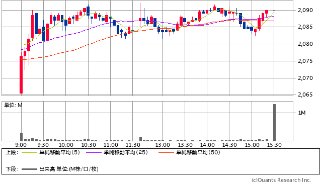 前日終値 2084円 → 本日終値 2090円 -13625円